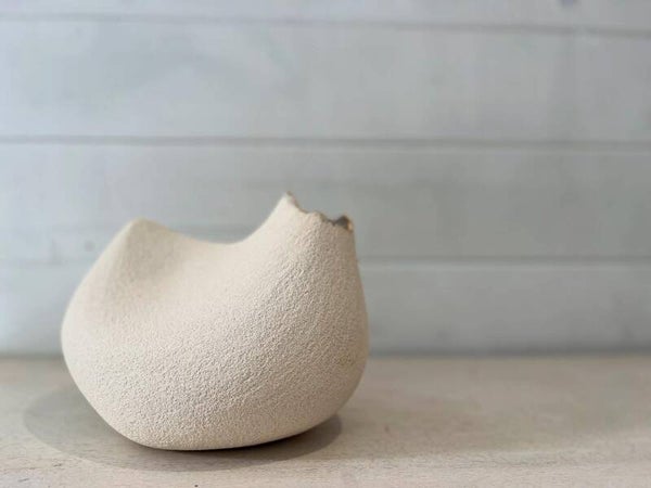 This collection is entirely hand-built, with each piece individually shaped. The outer surface is intentionally rough, exposing the grog in the clay to enhance its natural texture. Inside an alabaster glaze creates a smooth, soft contrast to the exterior. The rims are gilded with gold, highlighting the irregular openings and adding a refined finish to the organic form
