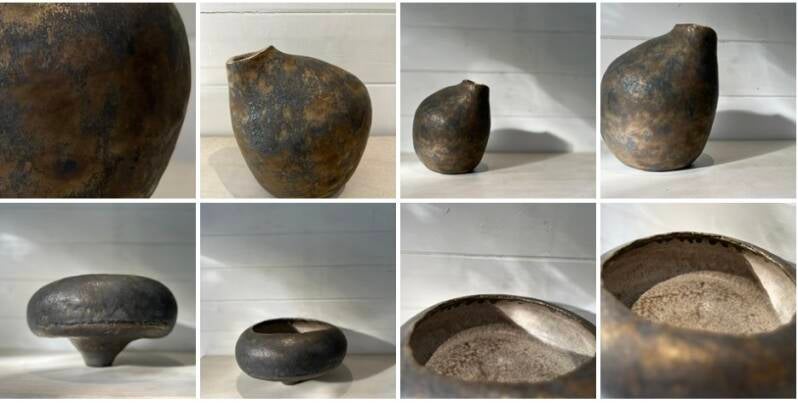 Each piece in this collection feels both anchient and alive. Their shapes are soft, almost breathing, yet carry the scares and stilness of time. Torn openings, quiet curves, and weathered textures echo the language of erosion, of vessels shaped by the elements not hand